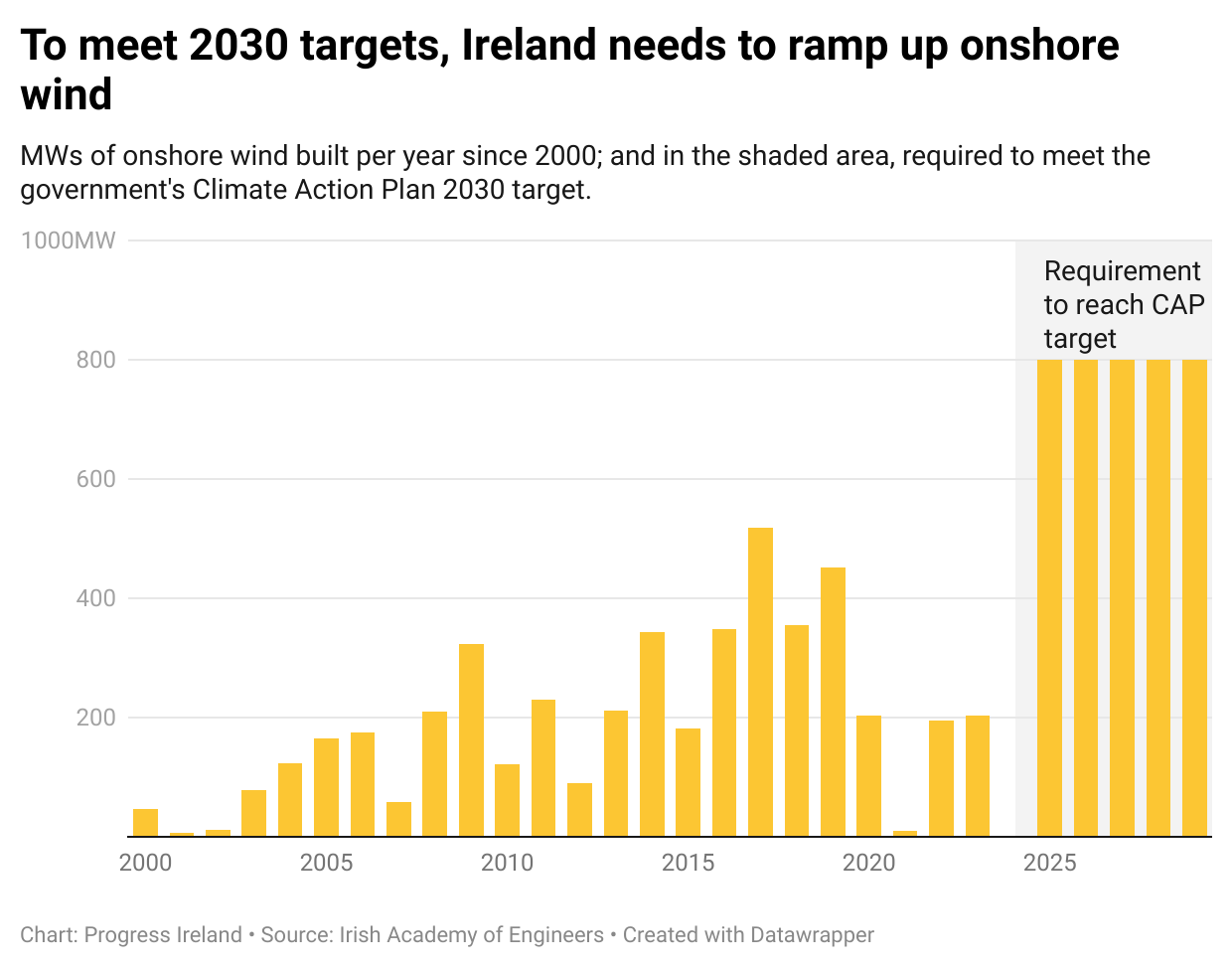 Eamonn O’Reilly: The report inevitably has a lot of numbers in it. That is one of the challenges of talking about the energy transition: you cannot understand it without looking at the numbers. So the report is dense in numbers and we can’t get away from that. For example, onshore wind: Ireland has just under 5,000 MW today, and Government policy is to reach 9,000 MW by 2030. That means each year we need to bring online more additional wind-power capacity than we have ever brought forward in a single year to date.