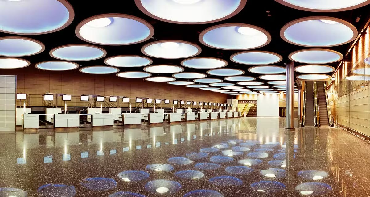 It’s a check-in overflow area now, but that’s not the purpose the hall, known as Area 14, was built for. Its extra high ceilings give it away: it was supposed to be a metro station. But that promise has never been fulfilled.