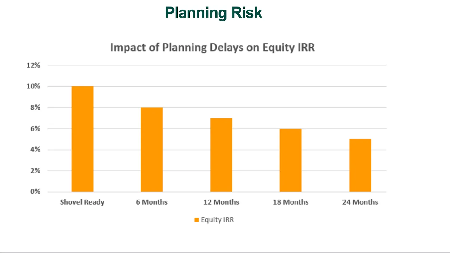 Planning refusal rates are also higher for brownfield sites at 22 per cent versus 18 per cent for greenfield sites. These delays make them more expensive, as shown by this graph from the Department of Finance. The longer the planning delay, the lower the returns.