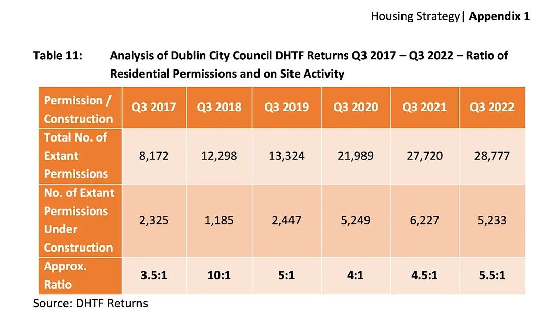 That figure is far too optimistic. The historic conversion rate between residential planning permissions and commencements in Dublin is about 4:1. So, even if a permission were granted on all of the 550 hectares, we should only expect about a quarter of them to turn into new homes in a cycle.