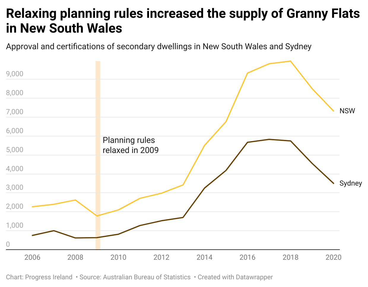 In 2009, the NSW government enacted the Affordable Rental Housing and State Environment Planning Policy (which expanded further in 2021). The 2009 rules allowed “secondary dwellings” to be built across much of the state. It removed parking requirements or the requirement for secondary dwellings to be attached. The change also made secondary dwellings effectively exempt from planning permission.