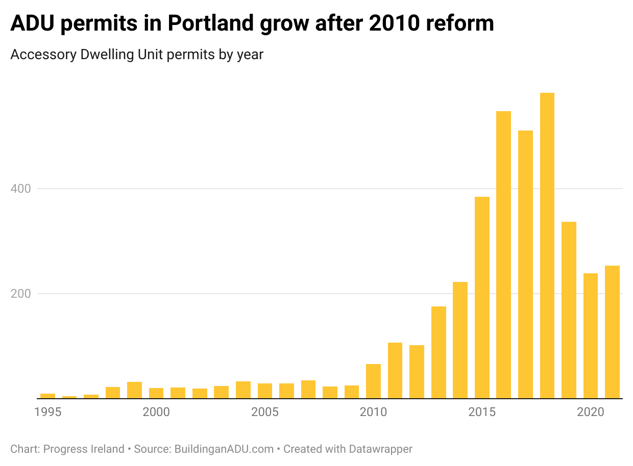ADUs have been permitted in Portland since the early 1980s. Senate bill 100, passed in 1973, created urban growth boundaries and set concrete house building goals. Importantly, city planners could not discriminate on housing type in meeting these targets.