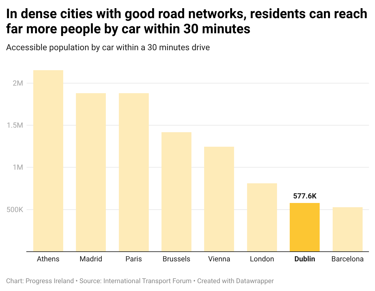 The top performers by car are Paris, Madrid, and Athens. For each, over 1.5 million people are reachable in <30 mins by car.