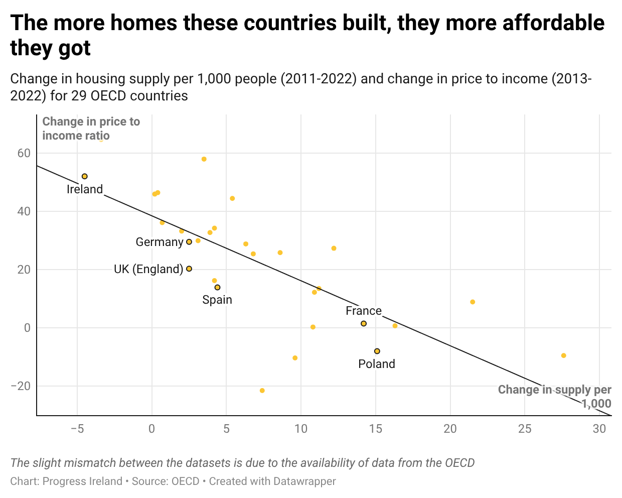 Abundance also gives people options for the type of home they can live in. A good housing system allows people to move through the housing system throughout their life. But as scarcity is the norm, people tend to be stuck. For example, 68 per cent of 25 to 29 year olds in Ireland live with their parents. In a healthy housing system, one can move into different types of home throughout one’s life.