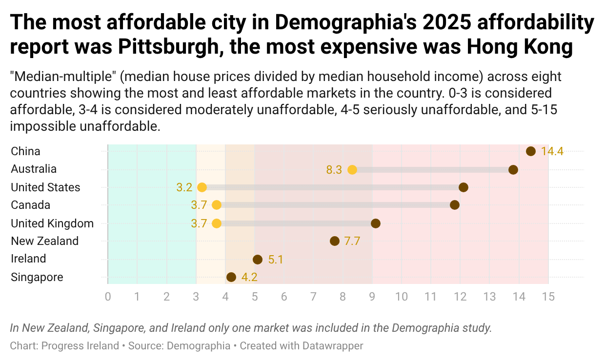 Another good measure of whether a housing system is affordable is the ratio of the median household income to the median house price. Each year, the Center for Demographics and Policy at Chapman University publishes a housing affordability report. The report measures an estimate of the “median-multiple” of cities. Their report shows Dublin’s median-multiple is 5.1 which they put in the “severely unaffordable” category. Pittsburgh, PA was the best performing city in the report, with a median-multiple of 3.2. The least affordable city in the report was Hong Kong, where the median house price was more than 14 times the median household income.