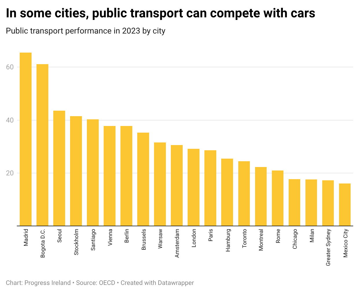 The underlying dataset from the report measures public transport performance relative to driving. For each functional urban area, the OECD estimates two things: (1) how many people an average resident can reach within 30 minutes by public transport, and (2) how many people they could reach within 30 minutes by car in traffic-free conditions. Public transport performance is the ratio of (1) to (2), expressed as a percentage. For example, a score of 30 means that, within 30 minutes, public transport reaches roughly 30 per cent of the people that could be reached by free-flow driving. You can see that in some cities like Madrid, public transport works extremely well.