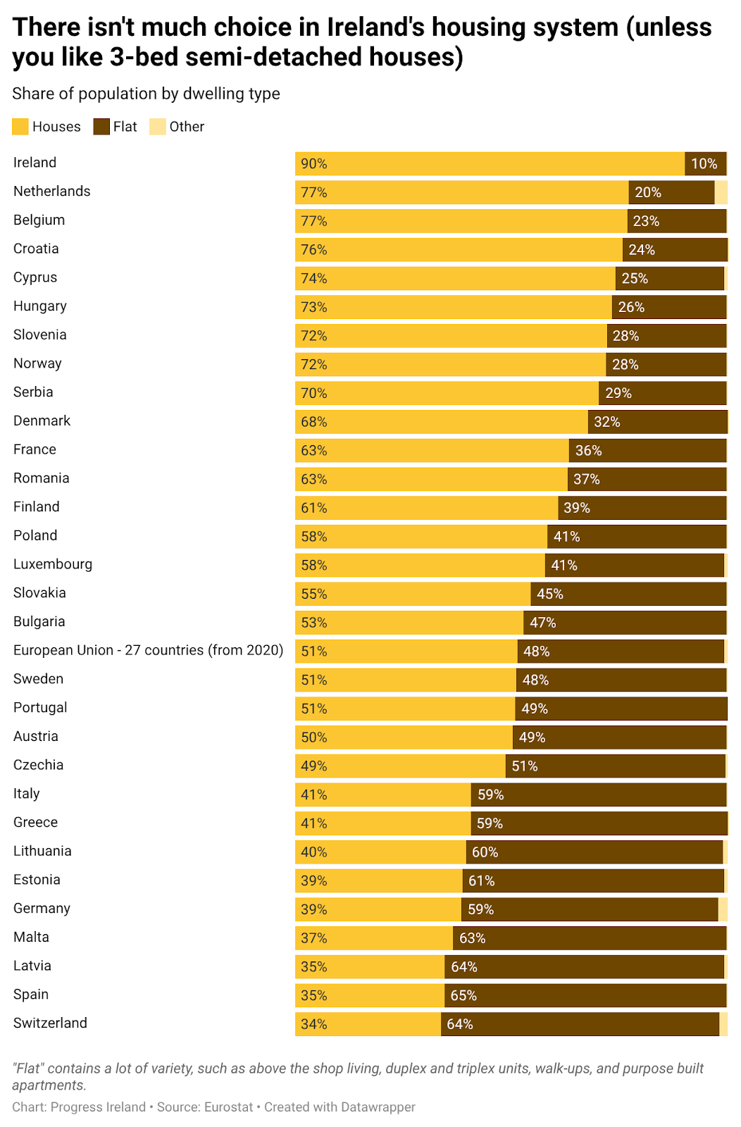 In Ireland, there is little variety in types of home. In fact, Ireland stands out in Europe for offering, predominantly, a single form of housing, a “house”.