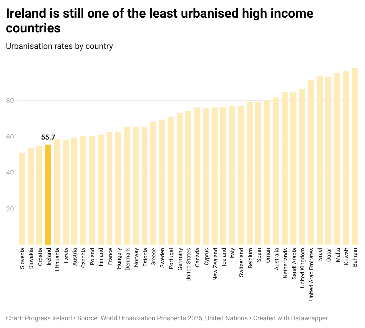 It’s important that housing is located in areas of highest demand. One reason for that is productivity: when people move to more productive areas, they become more productive. According to one French paper, a 10 per cent increase in the number of jobs accessible per worker corresponds to a 2.4 per cent increase in workers’ productivity. This is one reason why it is important that Ireland becomes more urbanised. At the moment, Ireland is one of the least urbanised high-income countries in the world (in 2016, Ireland was at the bottom of the list, but now Ireland is fourth from the bottom due to some newcomers into the category of ‘high income’).