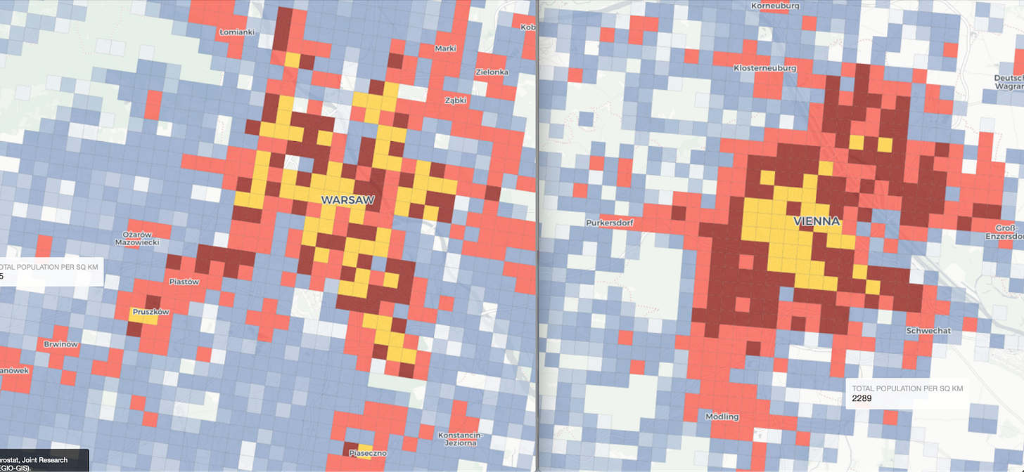 As we’ve seen, rent controls are what you get when governments maximise affordability by any means necessary. At other times, governments maximise abundance by any means necessary. When governments are fixated on building as many homes as possible, they sometimes situate them wherever it’s easiest to build, rather than where they’re most needed. Former Soviet or communist cities, for example, have a strange urban form in which dense apartment blocks are found at the edge of the city, far away from jobs and amenities. The following charts show the density of Warsaw and Vienna. Vianna follows the normal pattern in which the centre of the city (the place with the most jobs and amenities) is the most densely populated. Warsaw resembles a QR code, with random pockets of density across the entire urban area.